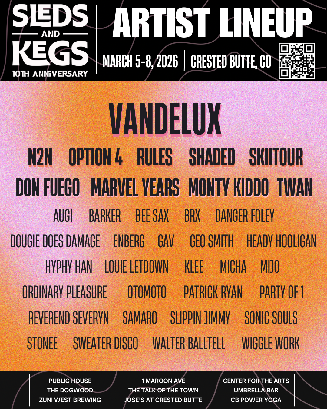 Come early, stay late, and don’t miss the Sleds & Kegs events at The Elevation Hotel & Spa and Jose all weekend long: Thursday 2-5 PM, Friday 2-5 PM, Sunday 12-5 PM! Finish your weekend with a bang on Sunday at the SkiiTour & Don Fuego grand finale!